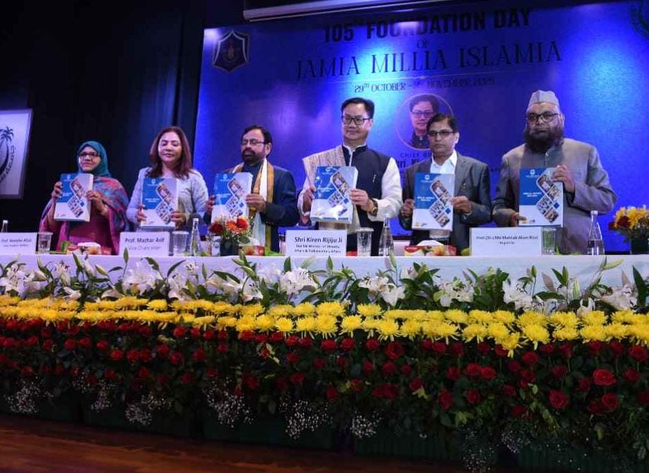जामिया मिल्लिया इस्लामिया (जेएमआई) ने आज विश्वविद्यालय के एम.ए. अंसारी सभागार में आयोजित एक भव्य उद्घाटन समारोह के साथ अपने 105वें स्थापना दिवस समारोह की शुरुआत की। इस कार्यक्रम का उद्घाटन केंद्रीय संसदीय कार्य और अल्पसंख्यक मामलों के मंत्री किरेन रिजिजू ने किया, जोकि जेएमआई के कुलपति प्रो. मज़हर आसिफ़, रजिस्ट्रार प्रो. मोहम्मद महताब आलम रिज़वी और छात्र कल्याण डीन प्रो. नीलोफर अफ़ज़ल की उपस्थिति में मुख्य अतिथि के रूप में उपस्थित थे।