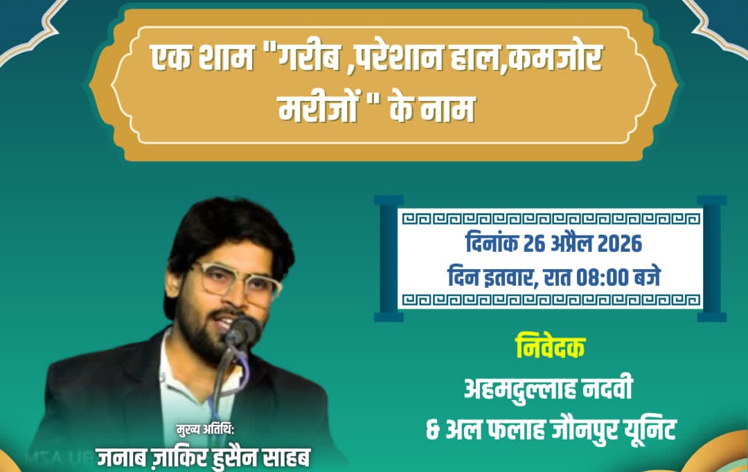 जौनपुर, 23 अप्रैल (रिपोर्टर) अल-फलाह फाउंडेशन (ब्लड डोनेट ग्रुप ) द्वारा 26 अप्रैल, 2026 को जौनपुर जिले के सबरहद गांव में एक भव्य समारोह का आयोजन किया गया है, जिसमें संगठन के संस्थापक और नि:शुल्क रक्तदान अभियान के संयोजक जाकिर हुसैन मुख्य अतिथि के रूप में शामिल होंगे। समारोह के आयोजक अहमदुल्लाह नदवी ने बताया कि कार्यक्रम भव्य होगा और क्षेत्रीय स्तर पर लोगों को रक्तदान के प्रति जागरूक किया जाएगा। इस अवसर पर अल-फलाह शाहगंज इकाई के यासिर पठान, अल-फलाह माहुल इकाई के अबु शाहमा माहुली पूर्व चेयरमैन माहुल बदरे आलम, फहीम खान शिराज़ी, माज़ एडवोकेट,खलीक शिराज़ी और अल-फलाह ब्लड ग्रुप के बड़ी संख्या में लोग उपस्थित रहेंगे।अहमदुल्लाह नदवी ने जनता से कार्यक्रम में भाग लेने की अपील की है।