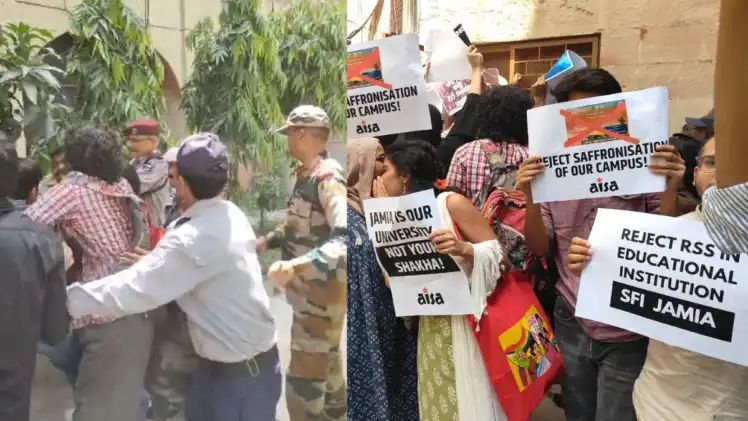 नई दिल्ली। जामिया मिल्लिया इस्लामिया में ‘युवा कुंभ’ नाम से आयोजित कार्यक्रम को लेकर विवाद गहरा गया है। विभिन्न छात्र संगठनों, खासकर आईसा (AISA), ने इस कार्यक्रम का विरोध करते हुए कैंपस में प्रदर्शन किया और ‘RSS गो बैक’ के नारे लगाए। प्रदर्शन के दौरान सुरक्षा बलों ने छात्रों को रोकने की कोशिश भी की, जिससे माहौल कुछ देर के लिए तनावपूर्ण हो गया।इसी के चलते कैंपस के बाहर भारी संख्या में पुलिस बल तैनात किया गया है।